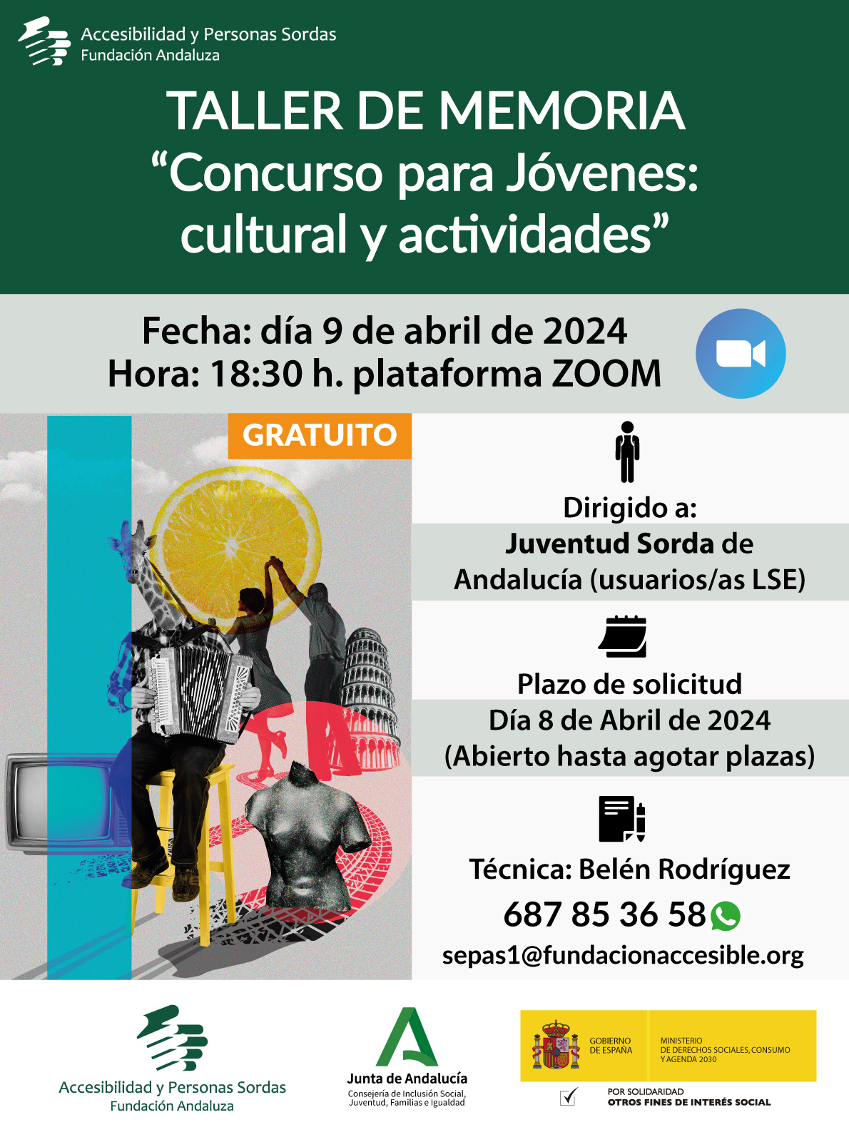 Taller de memoria “CONCURSO PARA JOVENES: CULTURAL Y ACTIVIDADES”, dirigido a mujeres sordas. Fecha límite para solicitudes: 8 de abril de 2024. Para inscribirte, envía